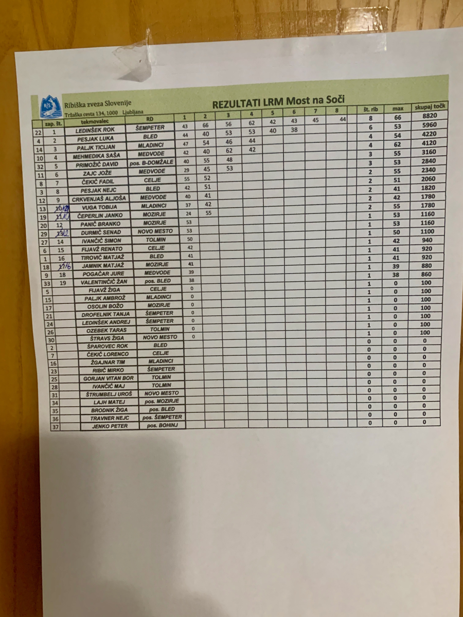 Rezultati članskega državnega prvenstva v muharjenju, jezero Most na Soči, Most na Soči / RD Tolmin, 22. 9. 2024 in končni rezultati