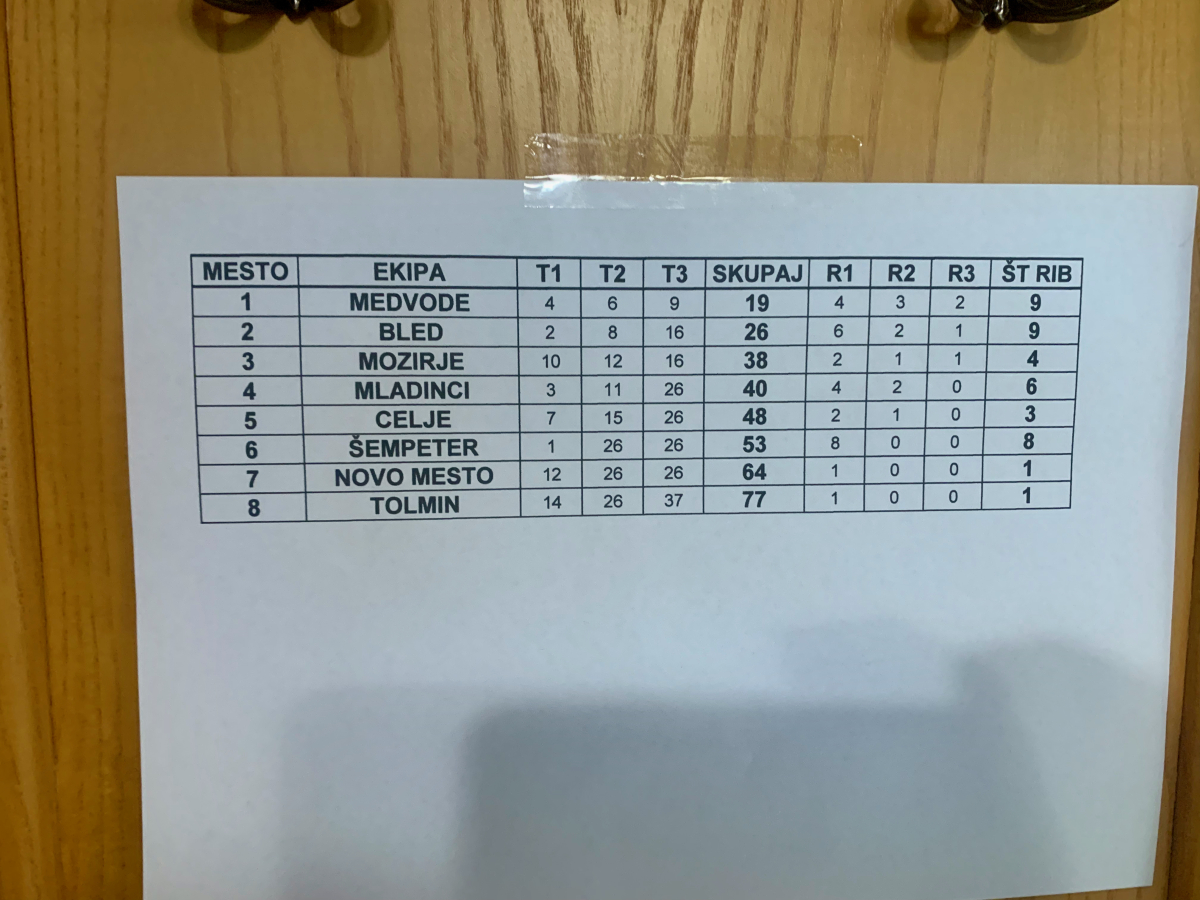 V ekipni razvrstitvi je prvo mesto ponovno osvojila ekipa Ribiške družine Bled v sestavi Luka Pesjak, Nejc Pesjak, Matjaž Tirovič in Rok Šparovec. Drugo mesto je osvojila ekipa Ribiške družine Medvode v sestavi Jože Zajc, Saša Mehmedika, Jure Pogačar in moja malenkost Aljoša Crkvenjaš, tretje mesto pa ekipa Ribiške družine Mozirje v sestavi Božo Osolin, Branko Panič, Matjaž Jamnik in Janko Čeperlin.