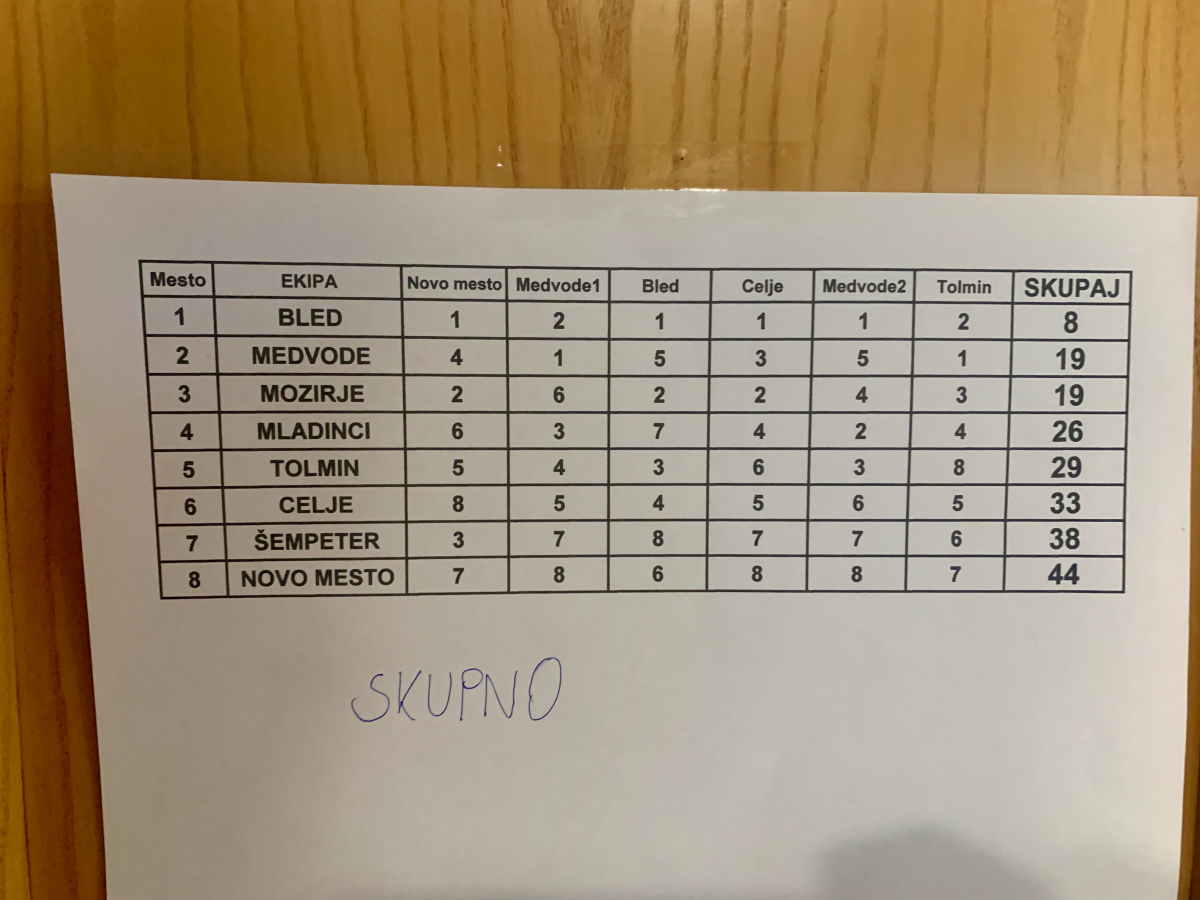 MestoTEKMOVALECEKIPANovo MestoMedvode1BledCeljeMedvode2TolminSKUPAJ